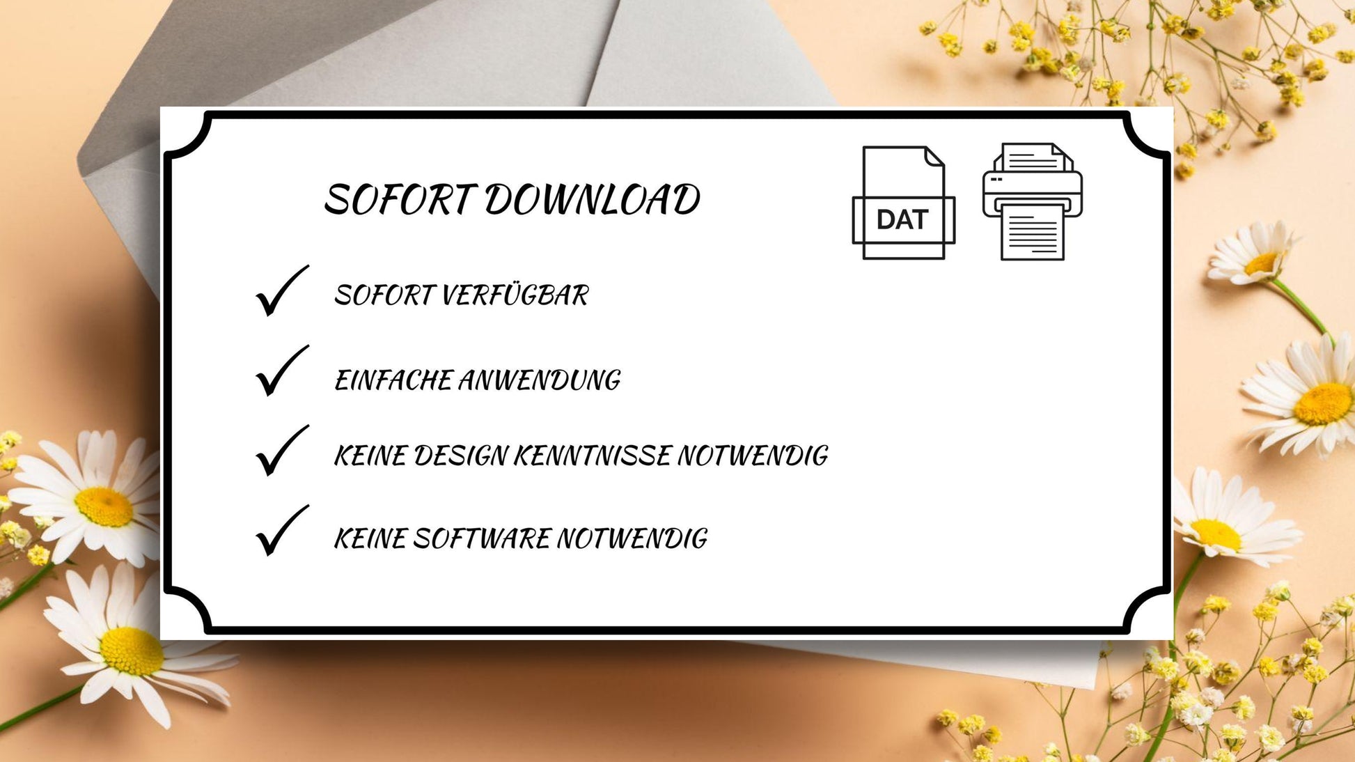 1. Selbst bearbeiten: nach dem Kauf erhältst Du ein PDF Dokument zum Herunterladen sowie einen Link, der beim Anklicken automatisch eine bearbeitbare Kopie in Canva öffnet. Bitte melde Dich kostenlos bei Canva an, um die Vorlage ganz nach Deinen Wünschen an – egal ob Texte, Daten, Überschriften oder sogar Schriftarten und Farben zu passen. Du kannst alle Elemente flexibel verändern – ganz ohne Software oder Designkenntnisse. Sobald Du mit dem Ergebnis zufrieden bist, lade Deinen Gutschein als PDF Datei herunter und anschließend kannst Du ihn ausdrucken.