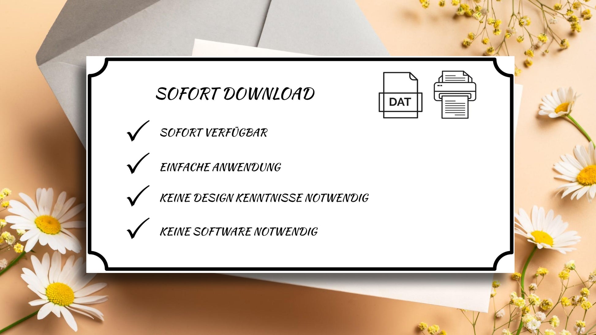 1. Selbst bearbeiten: nach dem Kauf erhältst Du ein PDF Dokument zum Herunterladen sowie einen Link, der beim Anklicken automatisch eine bearbeitbare Kopie in Canva öffnet. Bitte melde Dich kostenlos bei Canva an, um die Vorlage ganz nach Deinen Wünschen an – egal ob Texte, Daten, Überschriften oder sogar Schriftarten und Farben zu passen. Du kannst alle Elemente flexibel verändern – ganz ohne Software oder Designkenntnisse. Sobald Du mit dem Ergebnis zufrieden bist, lade Deinen Gutschein als PDF Datei herunter und anschließend kannst Du ihn ausdrucken.