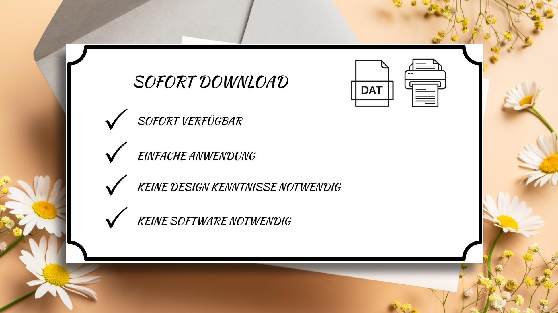 1. Selbst bearbeiten: nach dem Kauf erhältst Du ein PDF Dokument zum Herunterladen sowie einen Link, der beim Anklicken automatisch eine bearbeitbare Kopie in Canva öffnet. Bitte melde Dich kostenlos bei Canva an, um die Vorlage ganz nach Deinen Wünschen an – egal ob Texte, Daten, Überschriften oder sogar Schriftarten und Farben zu passen. Du kannst alle Elemente flexibel verändern – ganz ohne Software oder Designkenntnisse. Sobald Du mit dem Ergebnis zufrieden bist, lade Deinen Gutschein als PDF Datei herunter und anschließend kannst Du ihn ausdrucken.