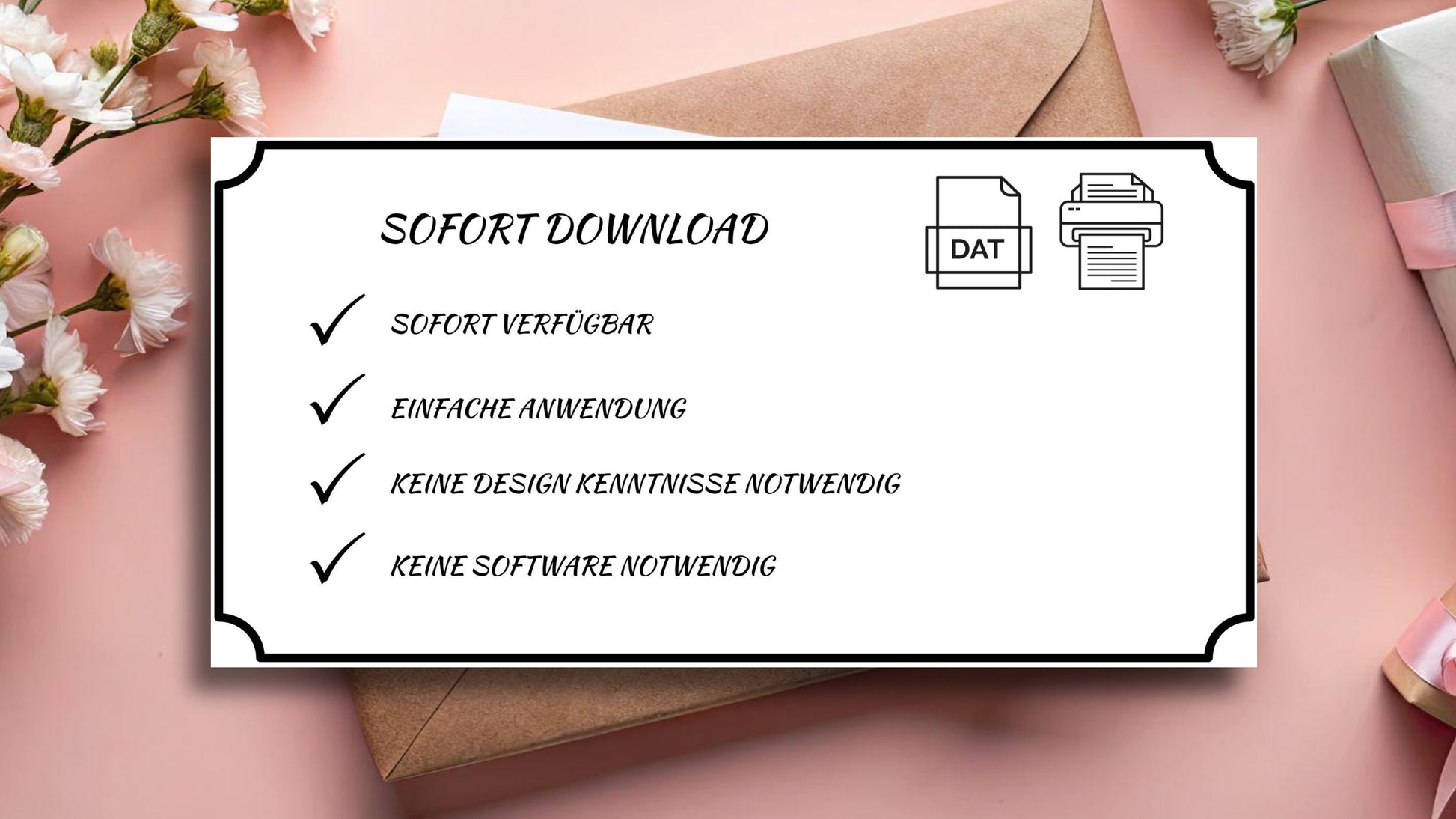 1. Selbst bearbeiten: nach dem Kauf erhältst Du ein PDF Dokument zum Herunterladen sowie einen Link, der beim Anklicken automatisch eine bearbeitbare Kopie in Canva öffnet. Bitte melde Dich kostenlos bei Canva an, um die Vorlage ganz nach Deinen Wünschen an – egal ob Texte, Daten, Überschriften oder sogar Schriftarten und Farben zu passen. Du kannst alle Elemente flexibel verändern – ganz ohne Software oder Designkenntnisse. Sobald Du mit dem Ergebnis zufrieden bist, lade Deinen Gutschein als PDF Datei herunter und anschließend kannst Du ihn ausdrucken.