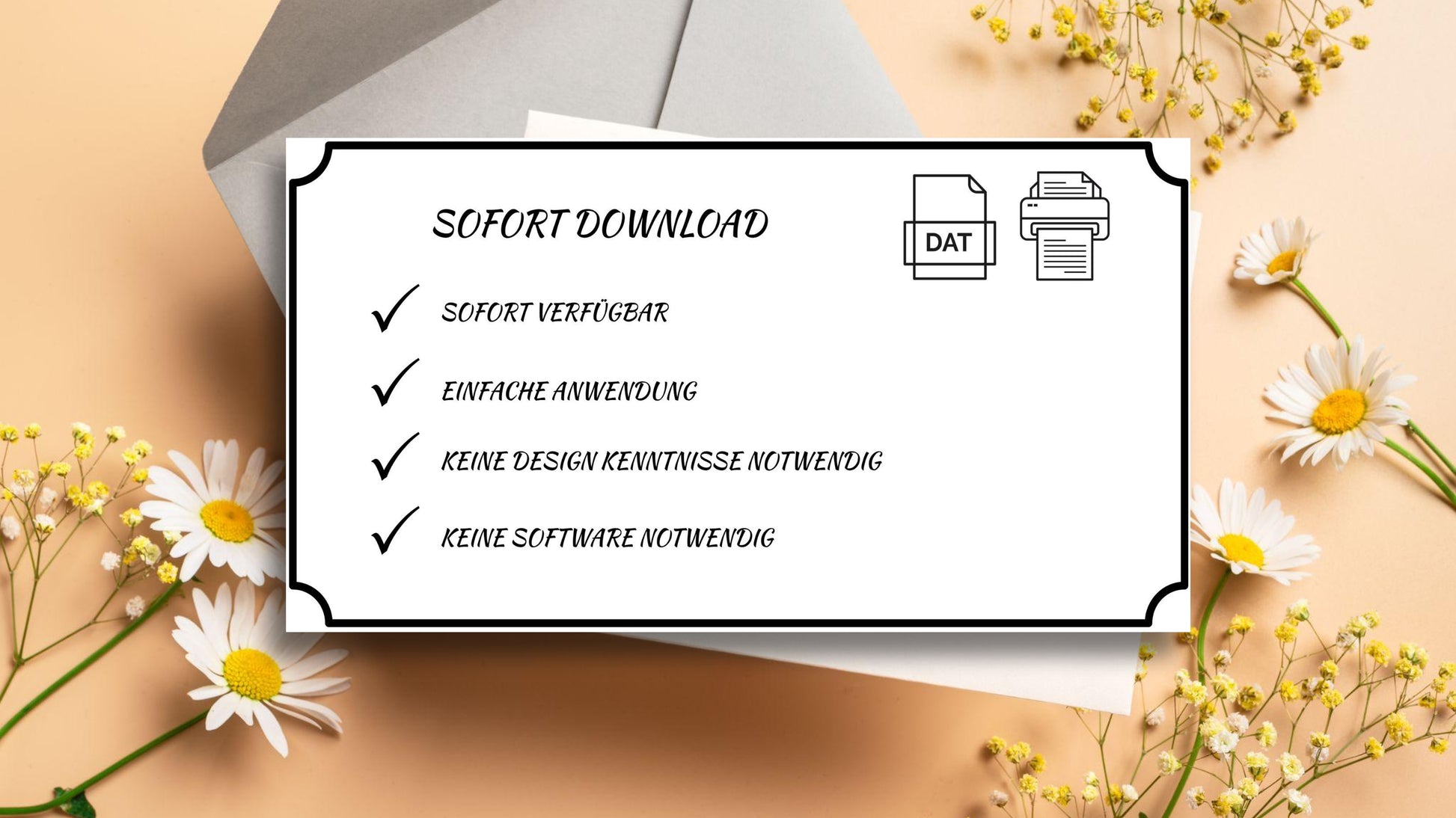 1. Selbst bearbeiten: nach dem Kauf erhältst Du ein PDF Dokument zum Herunterladen sowie einen Link, der beim Anklicken automatisch eine bearbeitbare Kopie in Canva öffnet. Bitte melde Dich kostenlos bei Canva an, um die Vorlage ganz nach Deinen Wünschen an – egal ob Texte, Daten, Überschriften oder sogar Schriftarten und Farben zu passen. Du kannst alle Elemente flexibel verändern – ganz ohne Software oder Designkenntnisse. Sobald Du mit dem Ergebnis zufrieden bist, lade Deinen Gutschein als PDF Datei herunter und anschließend kannst Du ihn ausdrucken.