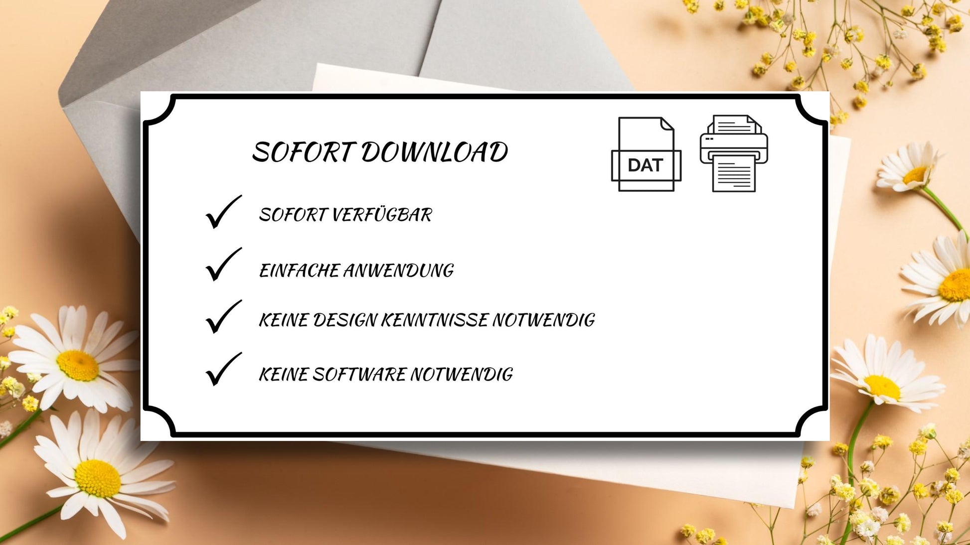 1. Selbst bearbeiten: nach dem Kauf erhältst Du ein PDF Dokument zum Herunterladen sowie einen Link, der beim Anklicken automatisch eine bearbeitbare Kopie in Canva öffnet. Bitte melde Dich kostenlos bei Canva an, um die Vorlage ganz nach Deinen Wünschen an – egal ob Texte, Daten, Überschriften oder sogar Schriftarten und Farben zu passen. Du kannst alle Elemente flexibel verändern – ganz ohne Software oder Designkenntnisse. Sobald Du mit dem Ergebnis zufrieden bist, lade Deinen Gutschein als PDF Datei herunter und anschließend kannst Du ihn ausdrucken.