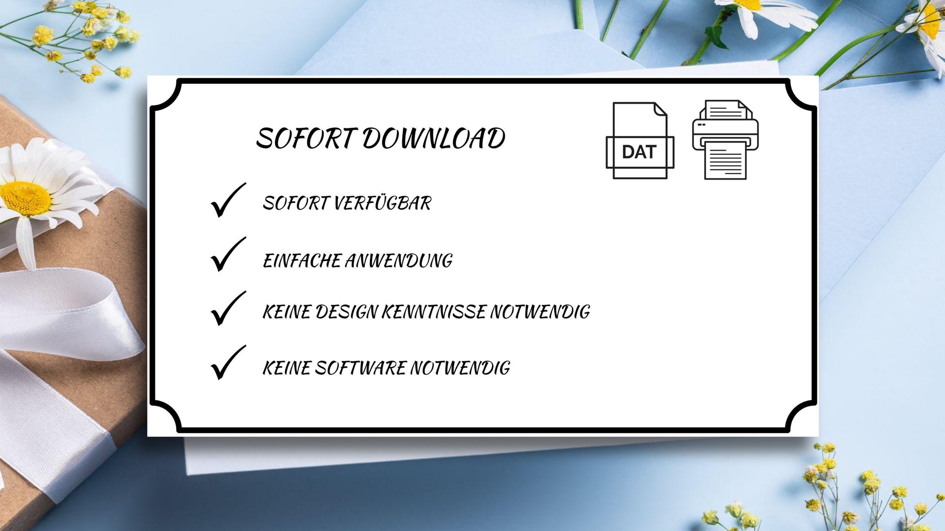 1. Selbst bearbeiten: nach dem Kauf erhältst Du ein PDF Dokument zum Herunterladen sowie einen Link, der beim Anklicken automatisch eine bearbeitbare Kopie in Canva öffnet. Bitte melde Dich kostenlos bei Canva an, um die Vorlage ganz nach Deinen Wünschen an – egal ob Texte, Daten, Überschriften oder sogar Schriftarten und Farben zu passen. Du kannst alle Elemente flexibel verändern – ganz ohne Software oder Designkenntnisse. Sobald Du mit dem Ergebnis zufrieden bist, lade Deinen Gutschein als PDF Datei herunter und anschließend kannst Du ihn ausdrucken.