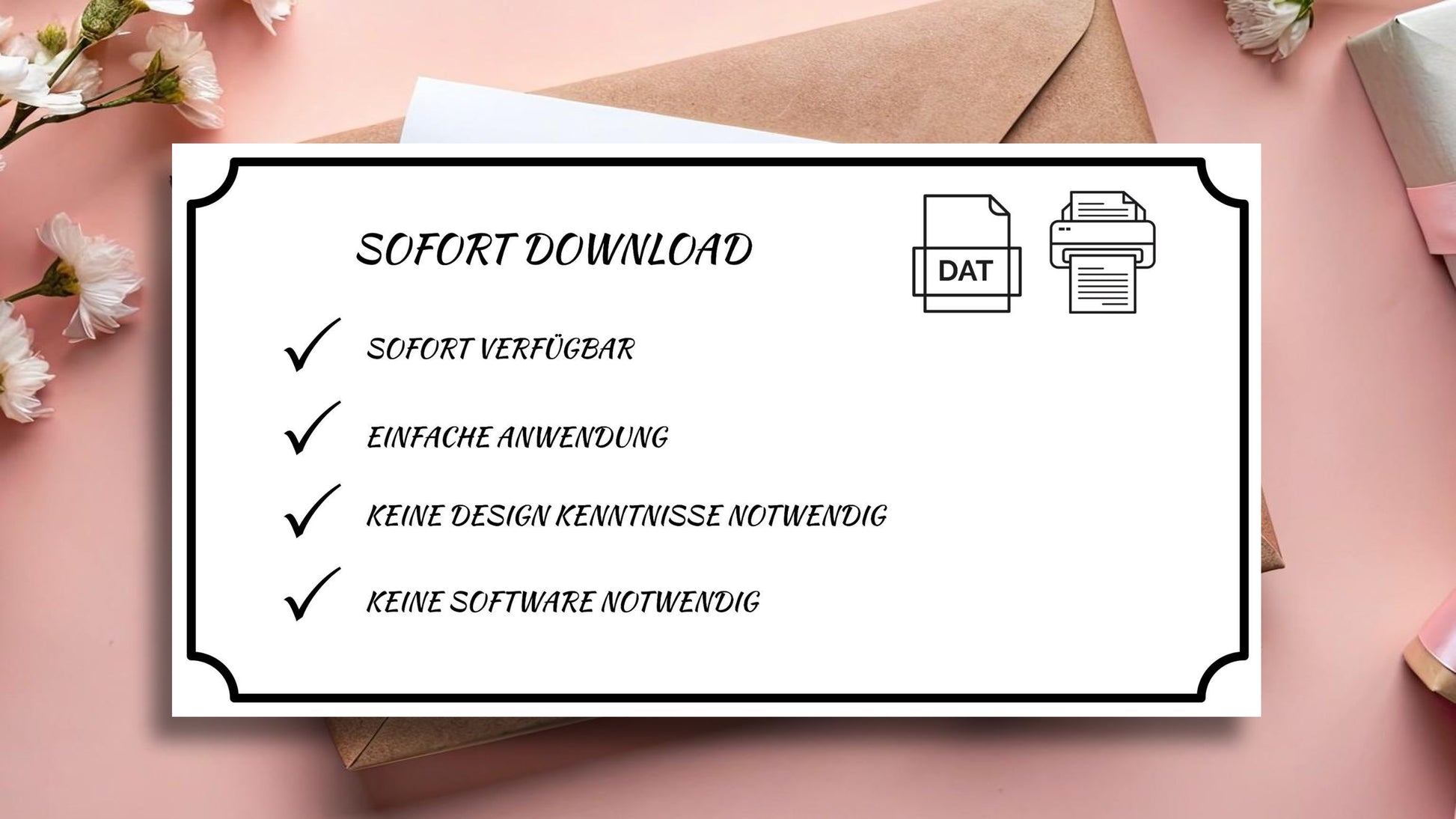 Mit unseren Gutscheinen lassen sich auch kurzfristige Geschenkideen mühelos realisieren. Und das Praktische: Die Vorlage steht Dir dauerhaft zur Verfügung. Elegantes Querformat – ideal zum Einlegen in Umschläge oder als besonderer Hingucker beim Verschenken.