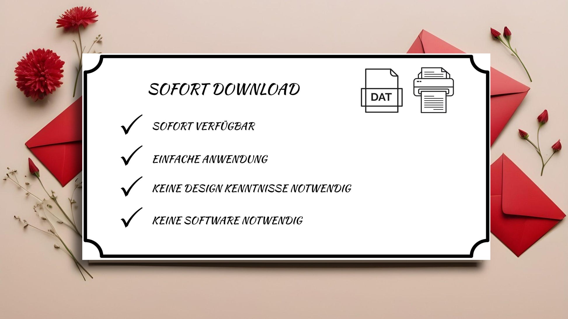 1. Selbst bearbeiten: nach dem Kauf erhältst Du ein PDF Dokument zum Herunterladen sowie einen Link, der beim Anklicken automatisch eine bearbeitbare Kopie in Canva öffnet. Bitte melde Dich kostenlos bei Canva an, um die Vorlage ganz nach Deinen Wünschen an – egal ob Texte, Daten, Überschriften oder sogar Schriftarten und Farben zu passen. Du kannst alle Elemente flexibel verändern – ganz ohne Software oder Designkenntnisse. Sobald Du mit dem Ergebnis zufrieden bist, lade Deinen Gutschein als PDF Datei herunter und anschließend kannst Du ihn ausdrucken.