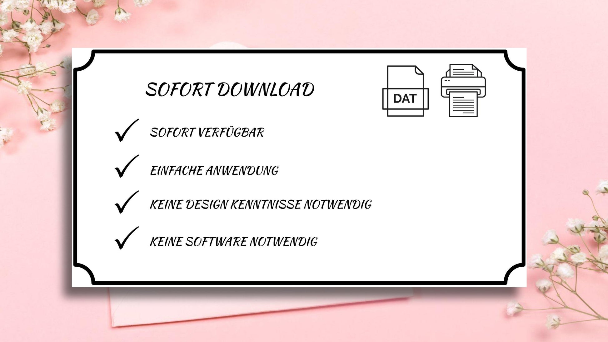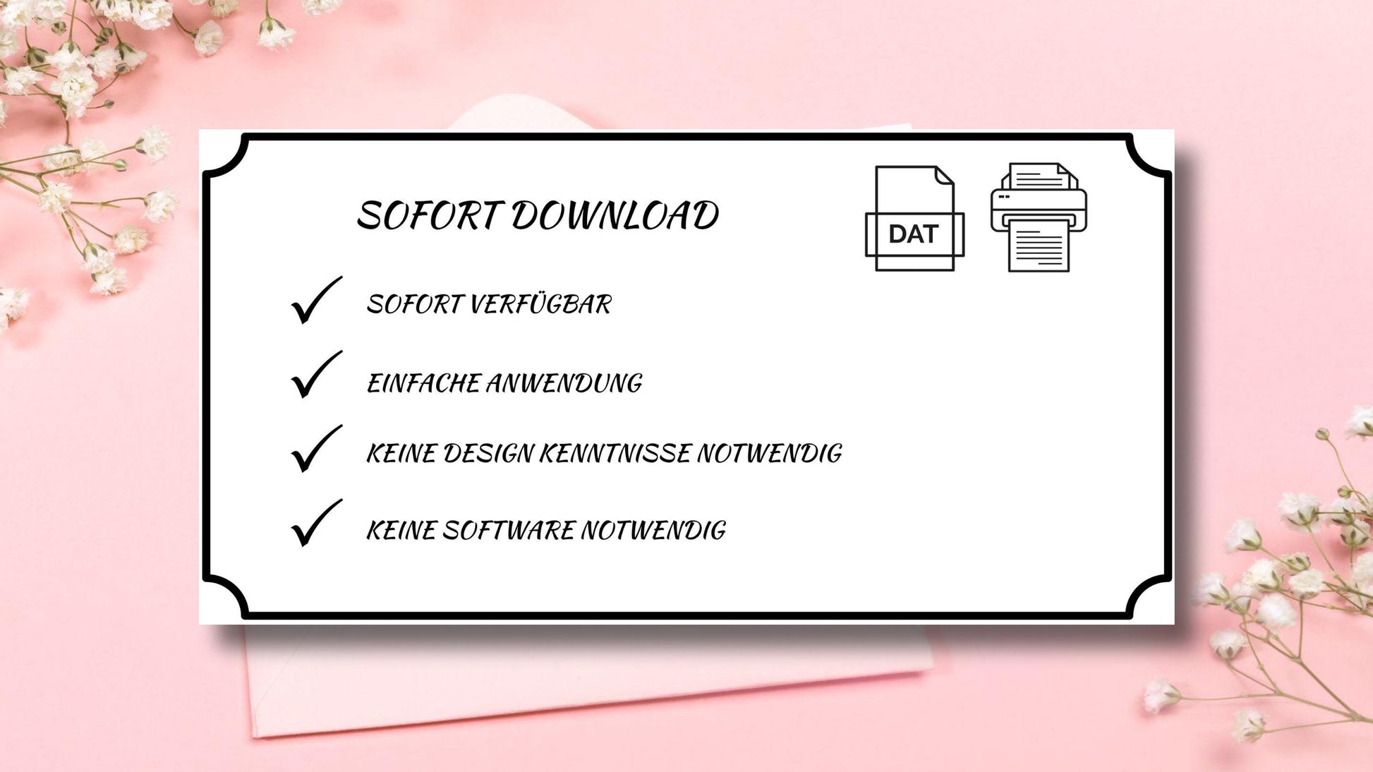 1. Selbst bearbeiten: nach dem Kauf erhältst Du ein PDF Dokument zum Herunterladen sowie einen Link, der beim Anklicken automatisch eine bearbeitbare Kopie in Canva öffnet. Bitte melde Dich kostenlos bei Canva an, um die Vorlage ganz nach Deinen Wünschen an – egal ob Texte, Daten, Überschriften oder sogar Schriftarten und Farben zu passen. Du kannst alle Elemente flexibel verändern – ganz ohne Software oder Designkenntnisse. Sobald Du mit dem Ergebnis zufrieden bist, lade Deinen Gutschein als PDF Datei herunter und anschließend kannst Du ihn ausdrucken.